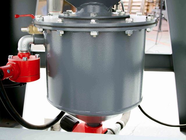 Герметизирующий конус-клапан автоматически запирает емкость и сжатый воздух начинает создавать давление внутри, способствуя подаче абразивного материала в дозатор абразива.