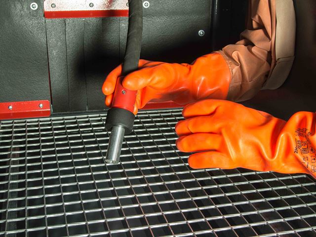 Абразивоструйные перчатки закреплены непосредственно на фронтальной поверхности камеры. Такая конструкция позволяет максимально защитить оператора от вылетающего абразива из камеры, а так же дополнительно герметизирует процесс работ.